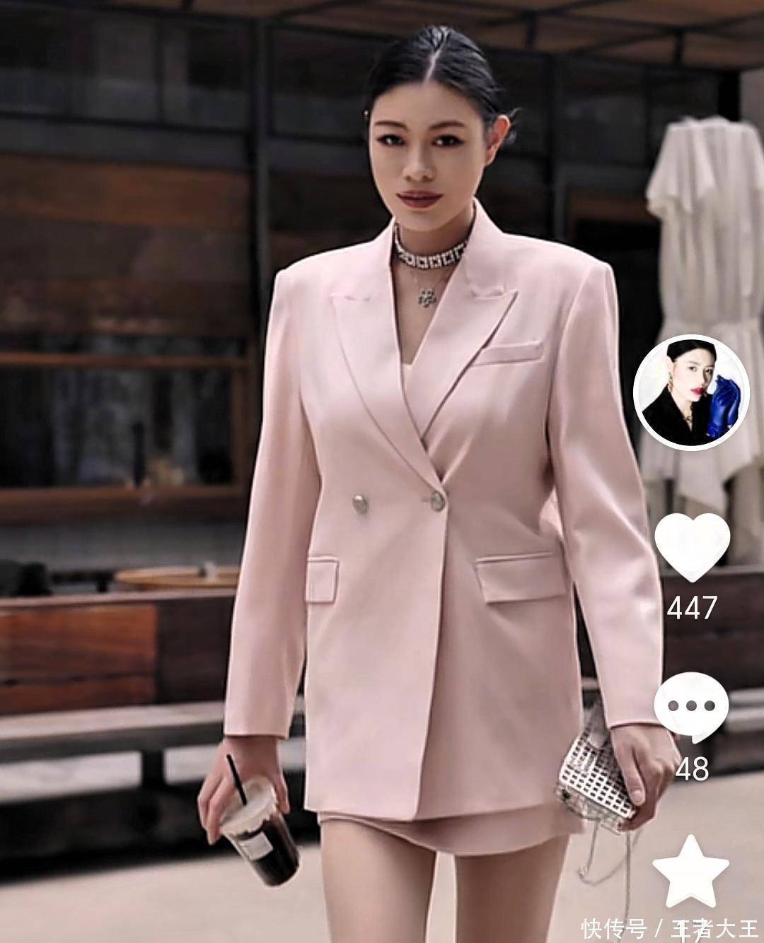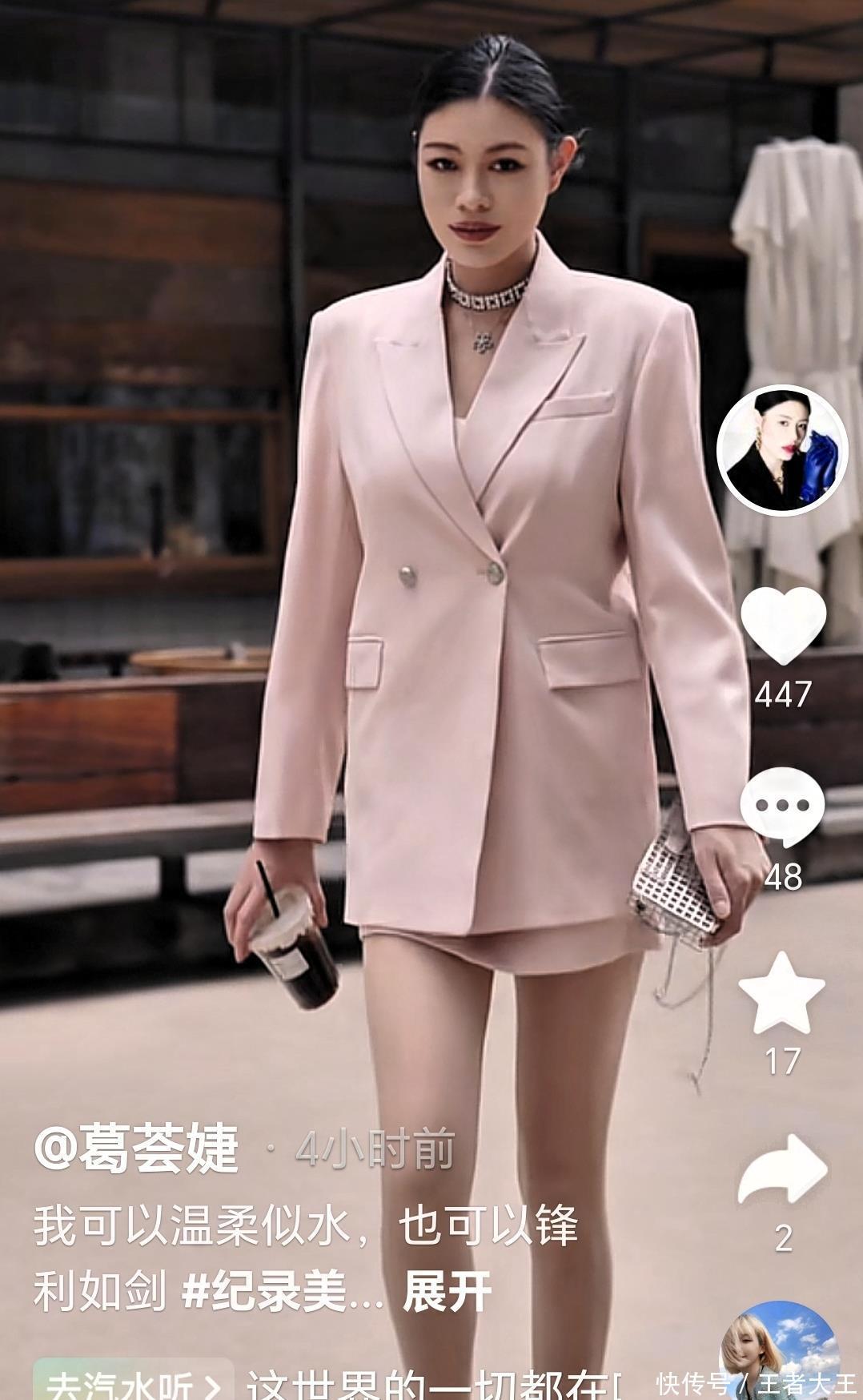 一改往日的黑色,灰色,白色和咖啡色的穿搭。葛荟婕今天竟然穿着一身粉红色的衣服,不是一件粉红色,是穿了一身粉红色,从里到外的粉红色。